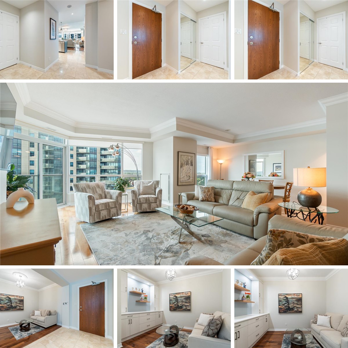 Custom One of a kind 1 Bedroom plus den, 2 bath suite at Nautica. Expansive 1,381 Square feet, this home could be easily converted back to a formal 2 Bed plus den. It is beautifully finished with hardwood flooring, Crown molding, 9' ceilings, custom lighting, loads of storage and ample room to entertain. Enjoy an expansive view of the water from the living room and walk out to the oversized balcony overlooking the beach and Kempenfelt Bay. The suite is situated to provide amazing sunrises and sunsets. Beautiful, customized kitchen with upgraded appliances, tile backsplash, breakfast counter with seating, granite counters, pendent lighting, pot lights, full height cabinetry, and oversized pantry cupboard. Spacious den has a gorgeous built-in unit; you could easily add a pull-out couch or murphy bed for guests. The extended living/dining area has a custom-built-in wine bar with glass cabinets, and storage for all your extras. Full 4-Piece main bath plus a gorgeous ensuite bath with walk-in shower, jetted soaker tub and upgraded vanity. Ensuite laundry combined with storage. Fantastic social activities and recreation facilities include an indoor pool, hot tub, sauna, exercise room, games room, party room, and library. Beautiful grounds and loads of indoor and outdoor spaces to enjoy. Indoor parking, locker, steps to the walking trails, beach, marina and Go station. Easy access to key commuter routes. Barrie has so much to offer, enjoy the shopping, restaurants, entertainment and many public festivals and year-round recreation. A wonderful well-established condo community you would be proud to call home!